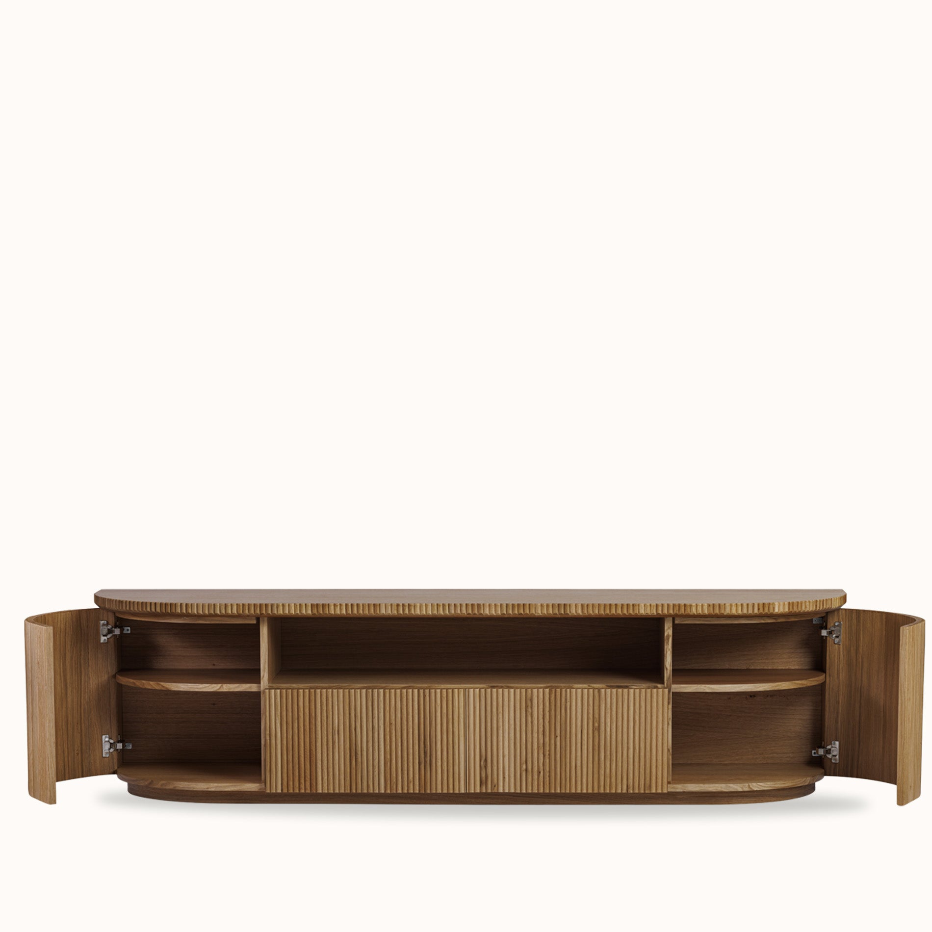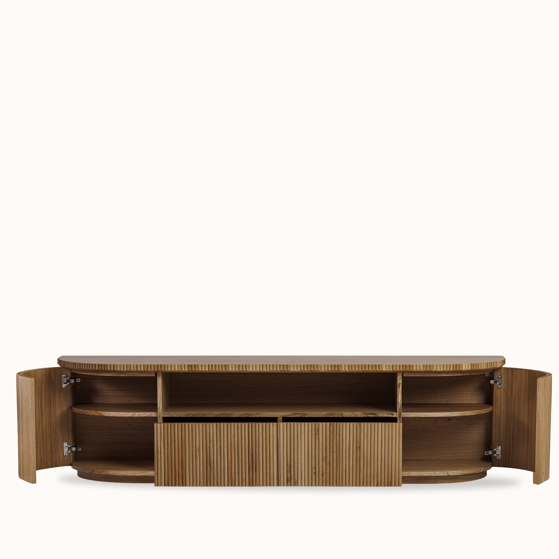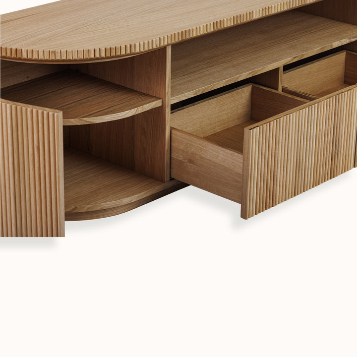 Fuga Tv Ünitesi, ahşap meşe kaplama yüzeyi ve dengeli formuyla salon ve ofis alanlarında düzenli ve şık bir kullanım sunar. İki kapaklı ve iki çekmeceli yapısı, elektronik ekipmanlar ve günlük eşyalar için pratik depolama alanı sağlarken, sade tasarımı mekâna modern bir görünüm kazandırır. Koleksiyon uyumu gözetilerek tasarlanan bu ünite, bulunduğu alanda bütünlüklü ve düzenli bir atmosfer oluşturur.