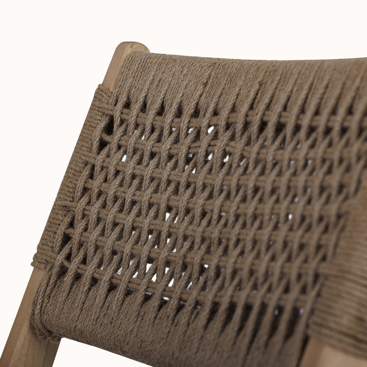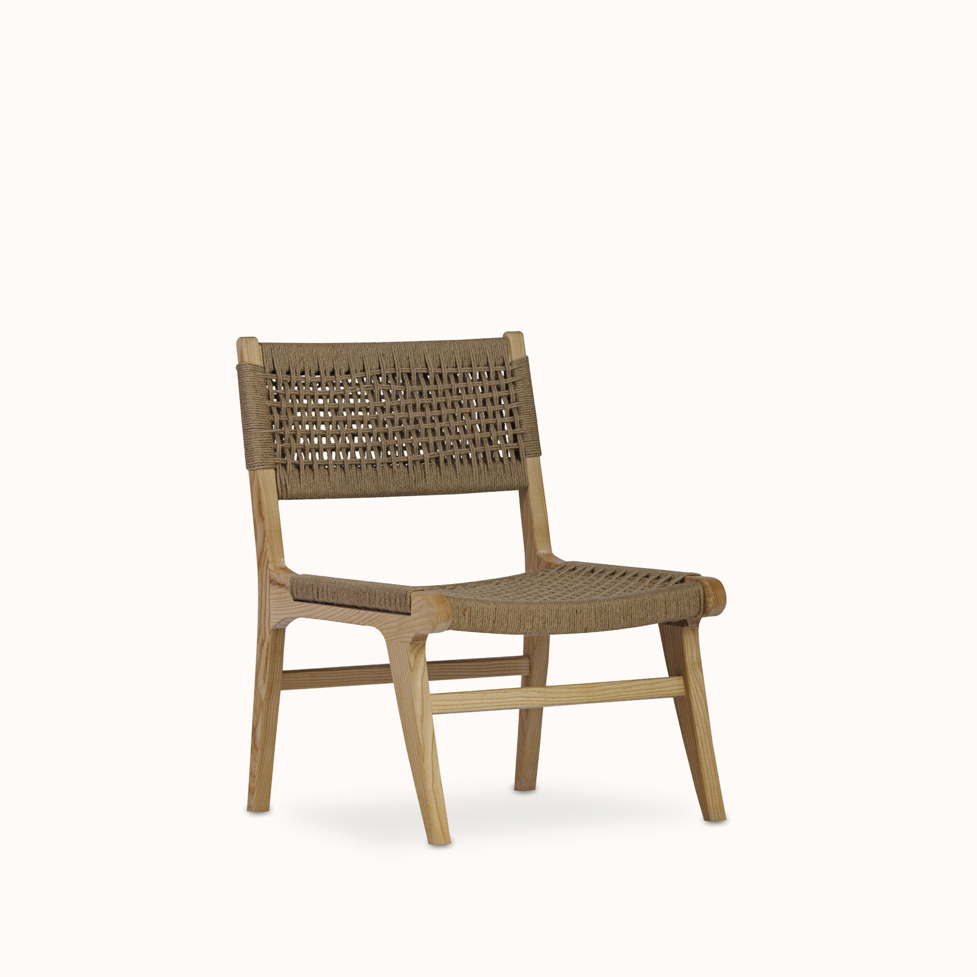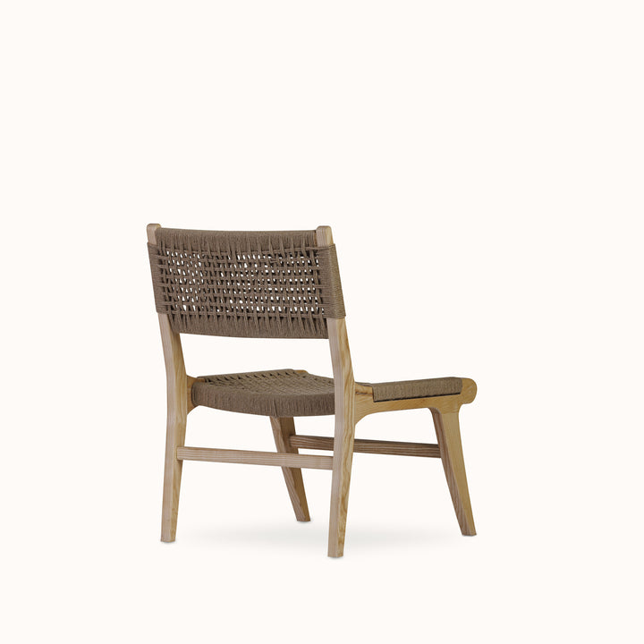 El işçiliğiyle örülen ip detayları ve kolsuz, yalın formu ile bu ahşap sandalye; sadeliğin içindeki ustalığı öne çıkarır. Doğal ahşap gövdesi dengeli ve güçlü bir duruş sunarken, ipli sırt ve oturum yüzeyi mekâna hafif, sıcak ve davetkâr bir karakter kazandırır